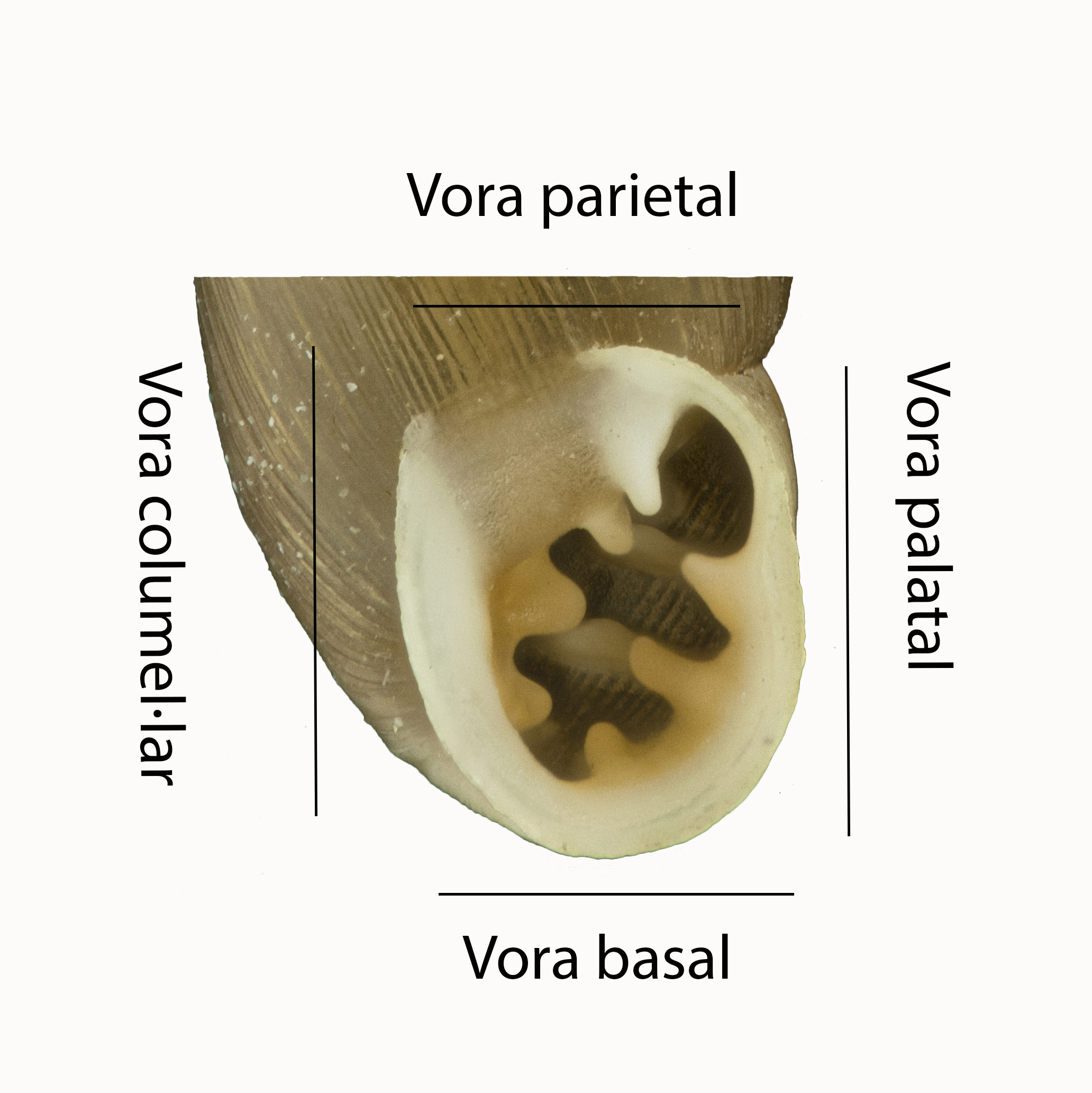 A l'obertura de les espècies de cargols, podem diferenciar quatre vores que serviran per localitzar els diferents denticles o lamel·les que hi presenten algunes espècies. Aquestes vores són: vora parietal, vora palatal, vora basal i vora columel·lar.